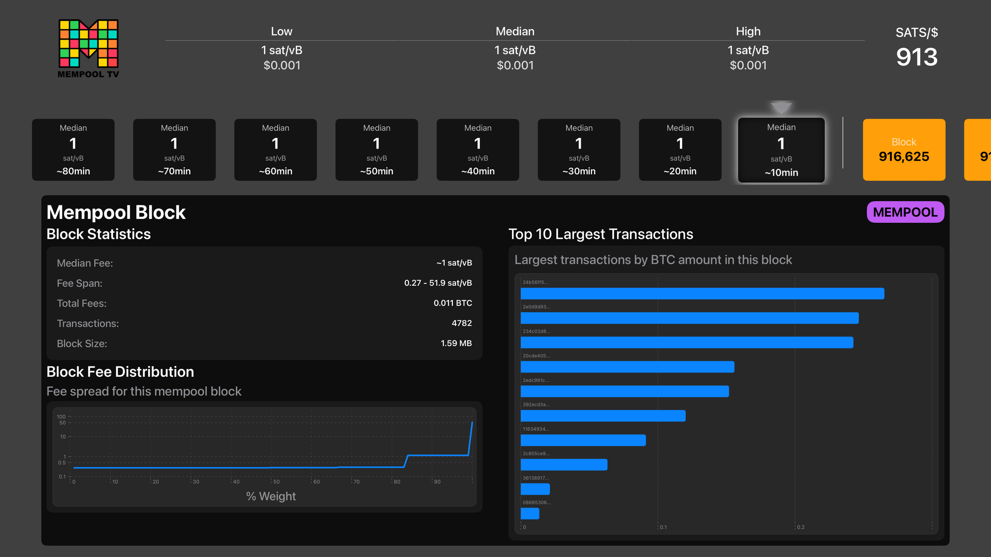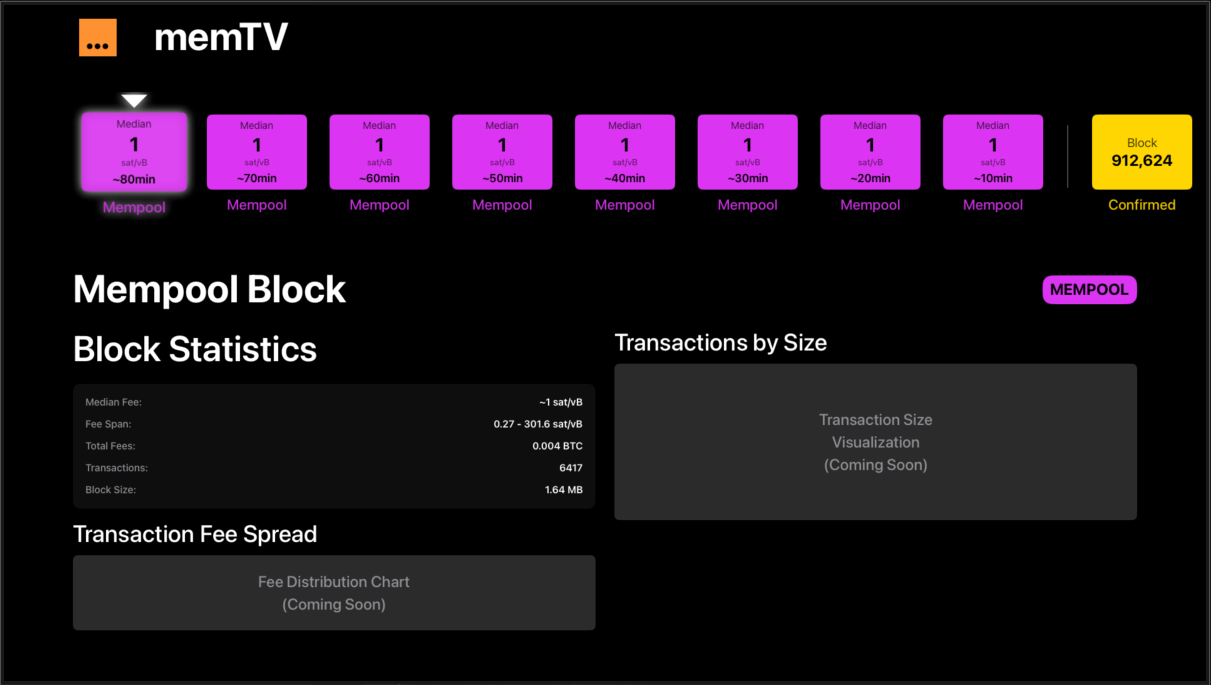 The second one is mempoolTV, a Bitcoin blockchain and mempool explorer. It shows a live view of the Bitcoin mempool — pending blocks, fee distributions, and transaction stats — all beautifully displayed for a TV screen. It’s like having a window into Bitcoin’s heartbeat, right in your living room.