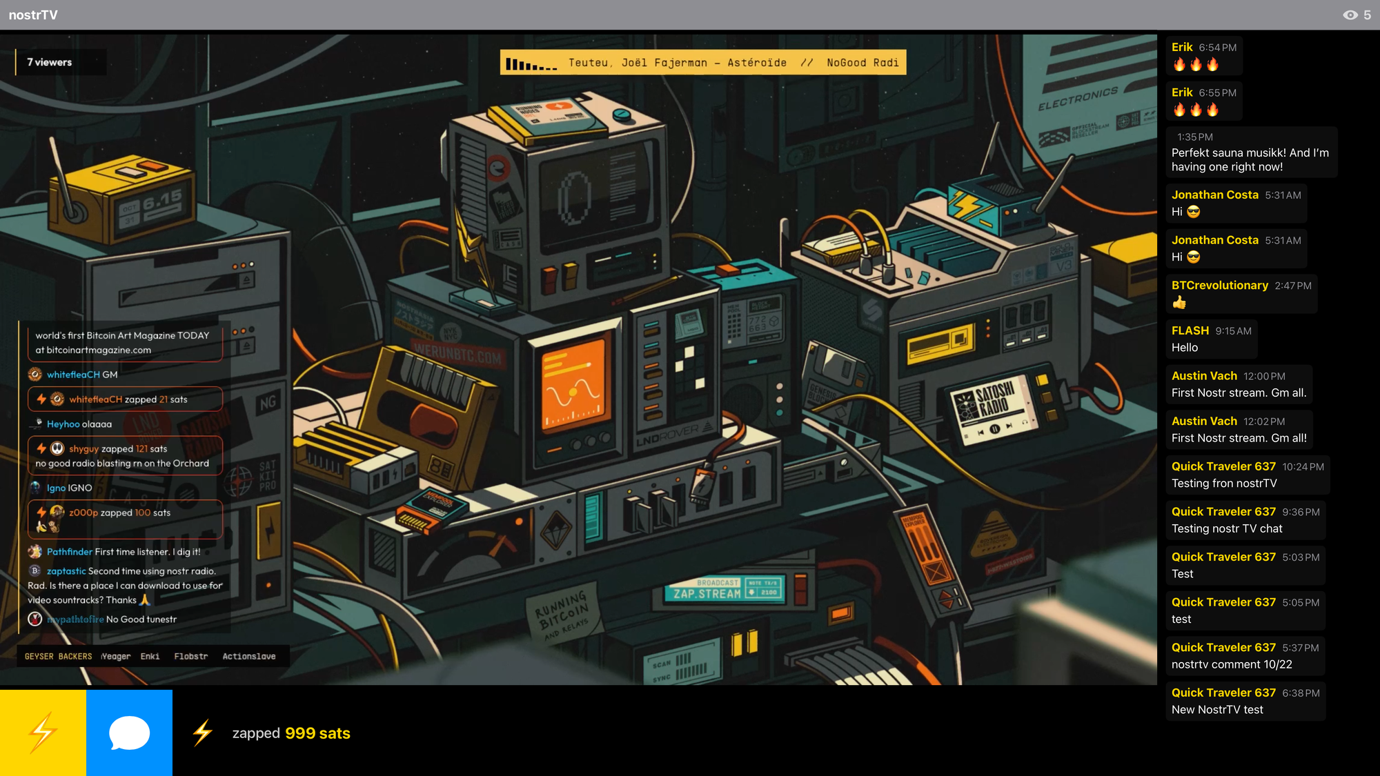 The goal with these apps isn’t just to show data — it’s to make Bitcoin and Nostr visible and interactive in a new way. I’d love for nostrTV to become a platform for musicians, artists, and creators to host concerts or events where viewers can zap them directly and chat in real time.